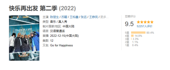 該綜藝剛播出幾期,便好評(píng)如潮。在豆瓣上更是獲得高達(dá)9.5分的亮眼成績(jī),隱隱有超越第一季(豆瓣9.6分)的勢(shì)頭。相信了解“0713”快樂男團(tuán)的網(wǎng)友都知道,六位男團(tuán)成員無論是在音樂成就上,還是在節(jié)目打造上,都致力于把生活中的種種快樂帶給觀眾們。