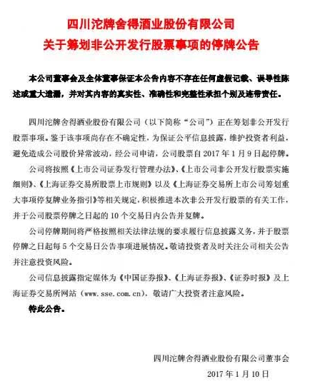 1月9日,四川沱牌舍得酒業(yè)股份有限公司發(fā)布關(guān)于籌劃非公開發(fā)行股票事項(xiàng)的停牌公告。公告稱,四川沱牌舍得酒業(yè)正在籌劃非公開發(fā)行股票事項(xiàng),鑒于該事項(xiàng)尚存在不確定性,為保證公平信息披露,維護(hù)投資者利益,避免造成公司股價(jià)異常波動而停牌。