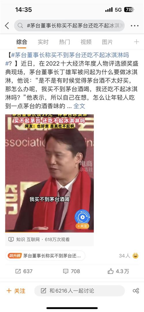 這一驚人言論確確實實出自茅臺董事長丁雄軍之口,但他的原話是“買不到茅臺酒喝,還吃不起冰淇淋嗎”。一字之差,含義卻相差甚遠:丁總想表達的是“老百姓買不到茅臺酒”,而不是嘲諷大家買不起茅臺酒。