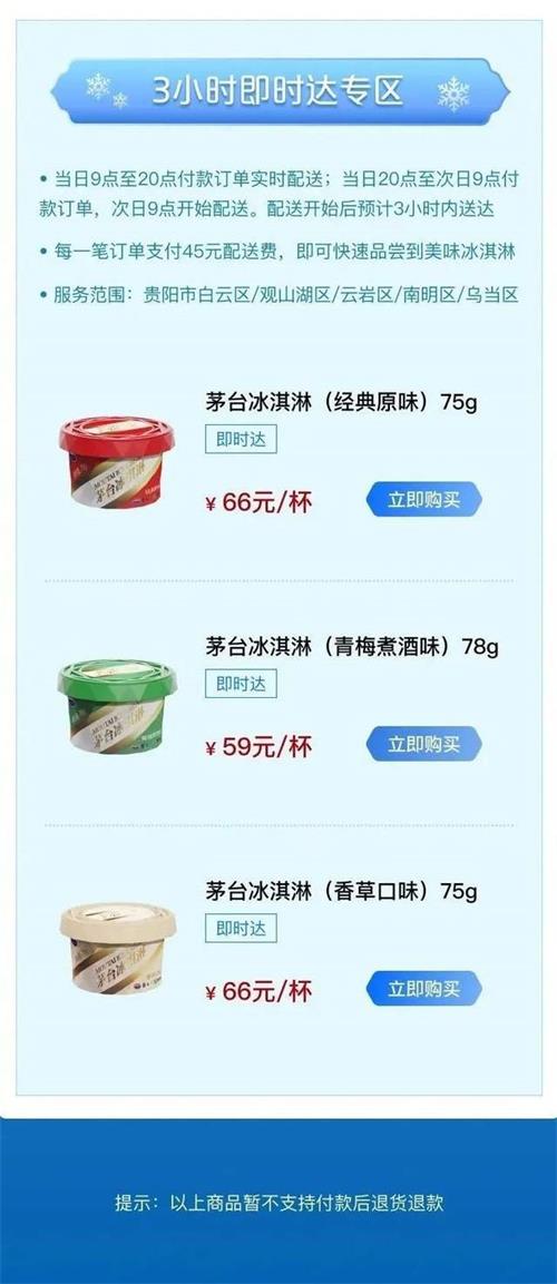 茅臺冰淇淋目前的SKU,依然是半年的經典原味、香草口味和青梅煮酒三款,除了最初有39元的嘗鮮價外,定價分別高達為66元/杯、59元/杯、66元/杯;線上下單配送還可能要額外付出至少35元/單的配送費。