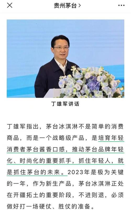 丁雄軍講到:茅臺冰淇淋不是簡單的消費商品,而是一個戰略級產品,是培育年輕消費者茅臺醬香口感,推動茅臺品牌年輕化、時尚化的重要抓手,抓住年輕人,就是抓住茅臺的未來。