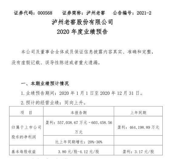 繼茅臺、五糧液、汾酒之后,瀘州老窖也披露了2020年年度業(yè)績預告。