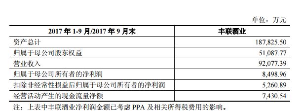 當(dāng)天,老白干還發(fā)布了《豐聯(lián)酒業(yè)控股集團(tuán)有限公司審計(jì)報(bào)告》,報(bào)告指出2017年1-9月份,豐聯(lián)酒業(yè)實(shí)現(xiàn)營(yíng)業(yè)收入9.2億元,歸屬于母公司股東的凈利潤(rùn)為8498.96萬(wàn)元。而2016 年豐聯(lián)酒業(yè)收入為 11.2 億元,按照白酒年底是銷售旺季的市場(chǎng)規(guī)律,2017年豐聯(lián)酒業(yè)業(yè)績(jī)已經(jīng)開始好轉(zhuǎn)。