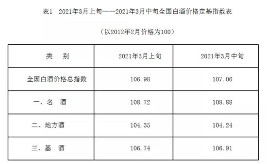 據(jù)全國白酒價(jià)格調(diào)查資料顯示,2021年3月中旬全國白酒商品批發(fā)價(jià)格定基總指數(shù)為107.06,上漲7.06%。其中,名酒價(jià)格指數(shù)為108.88,上漲8.88%;地方酒價(jià)格指數(shù)為104.24,上漲4.24%;基酒價(jià)格指數(shù)為106.91,上漲6.91%。(見表1)