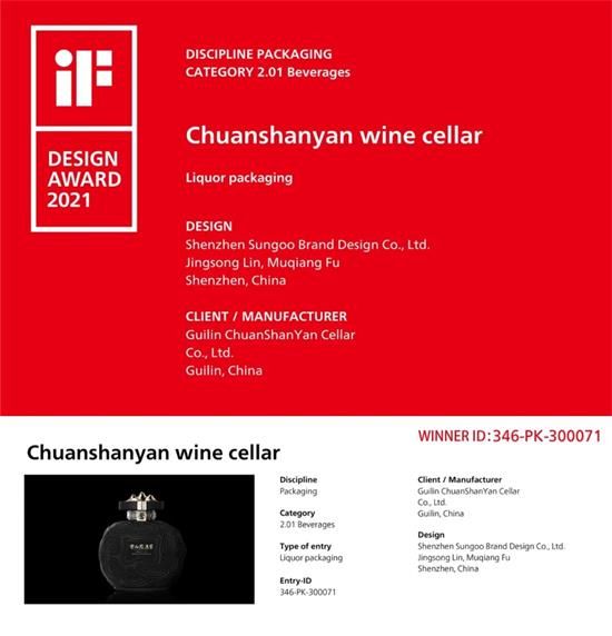 The design of this liquor packaging for "Chuanshanyan Wine Cellar" relies on design elements to express premium quality and "Shengde Ruoyu,” which in Chinese means a virtuous and modest gentleman always looks simple in appearance.