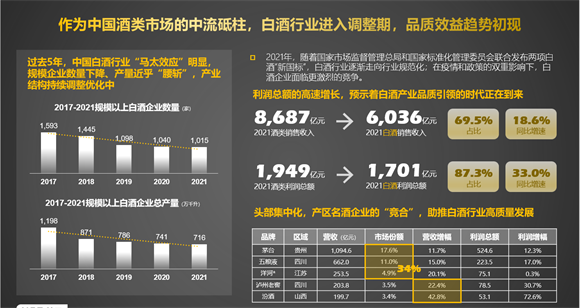 2022年6月1日,國家市場監督管理總局和國家標準化管理委員會聯合發布的兩項白酒“新國標”施行,白酒行業準入門檻提高。受疫情和政策雙重影響,白酒行業面臨激烈競爭。作為中國酒類市場的中流砥柱,白酒產業在2021年共計8678億酒類銷售收入中占比達到69.5%。整體酒類1949億元利潤總額中,白酒更是達到1701億的利潤。