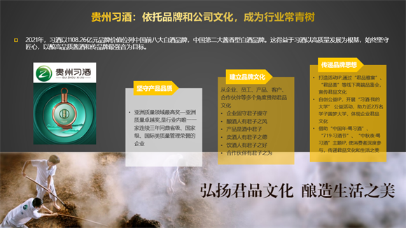 3.從品牌營銷分析:53度和43度依然是醬香酒的必備基礎,中高度小眾醬香酒市場的快速增長,體現出白酒在年輕化趨勢上的新嘗試,社交屬性強的醬香酒具有較強的送禮心智,包裝規格仍以精致輕量的500-1000mL為主,定制化的瓶裝或禮盒裝適用于多場合需求,仍是品牌在包裝規格上發展的重點。在這一點上很多白酒企業都狠下功夫,其中做得比較好的是貴州習酒,2021年習酒以1108.26億元品牌價值位列中國前八大白酒品牌、中國第二大醬香型白酒品牌。另有成為醬香酒行業黑馬的金沙酒,主推醬香名酒和摘要高端醬香酒的雙品牌運營戰略,摘要高端醬香酒更成為犒賞性自飲的風向標,主推三款戰略單品,并在中高端產品上標注真實年份,也是高端醬酒的有力證明,一舉讓金沙酒從地方性品牌發展成醬香酒品牌價值全國第三的企業。目前市場各類醬香酒價格可歸為四類:平價版在150-349元之間,中級:350-998之間,中高級:999-1400元之間,高級是以茅臺為首的1400+的價格。
