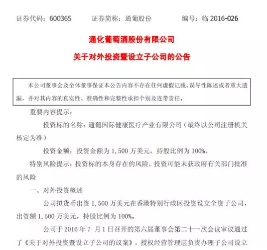 據通葡股份于7月2日發布的《通化葡萄酒股份有限公司關于對外投資暨設立子公司的公告 》顯示,通葡股份擬設立通葡國際健康醫療產業有限公司(以下簡稱“香港子公司”), 通過參與專業醫療投資基金或直接股權投資等方式投資香港當地專業醫療機構。 香港子公司主要定位于從事醫療產業投資和健康產業投資。公司現擬通過香港子公司投資的標的公司是一家主要從事投資全球再生醫學產品的研發和商業化,以及優質醫院和醫療中心的專業醫療投資集團,其醫療產品和醫療服務內容主要包括:干細胞專利技術和治療產品,國際醫療、在線會診、生物醫學檢測和健康體檢,以及再生醫學抗衰老產品等。