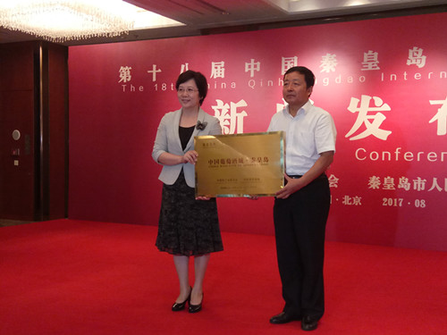 在新聞發(fā)布會(huì)上,何燁代表中國輕工業(yè)聯(lián)合會(huì)和中國酒業(yè)協(xié)會(huì),正式授予秦皇島市“中國葡萄酒城”榮譽(yù)稱號牌匾。
