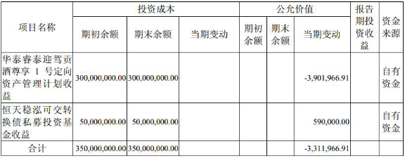 中國經(jīng)濟網(wǎng)記者查看半年報中上半年迎駕貢酒的投資成績單,發(fā)現(xiàn),上半年,公司3億元投資華泰睿泰迎駕貢酒尊享 1 號定向資產(chǎn)管理計劃收益,這一投資公允價值減少了390萬;迎駕貢酒5000萬元投的恒天穩(wěn)泓可交轉(zhuǎn)換債私募投資基金收益公允價值增加了59萬。兩項3.5億元的投資合計公允價值減少了331萬元。