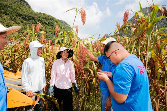 置身北緯25°貴州省安龍縣,漫山遍野的紅糧隨風搖曳,一株株高粱穗壓彎了枝頭。蟲鳴、鳥叫、鐮刀揮動、轟鳴的收割機……一派豐收的忙碌景象。
