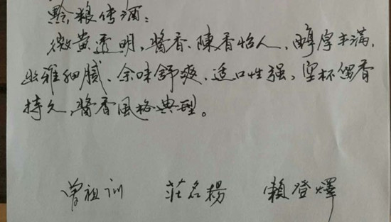 會(huì)上,專家對(duì)黔糧傳進(jìn)行了認(rèn)真、嚴(yán)謹(jǐn)?shù)钠吩u(píng),從色、香、味、空杯等多個(gè)角度進(jìn)行了鑒定。最后對(duì)黔糧傳得出這樣的評(píng)價(jià):“微黃透明,醬香陳香怡人、醇厚豐滿、幽雅細(xì)膩、余味舒爽、適口性強(qiáng),空杯留香持久,醬香風(fēng)格典范。”