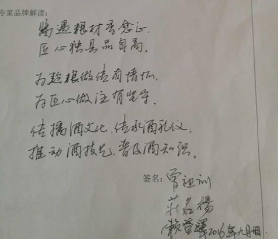 所以,對(duì)于白酒的發(fā)展,我們應(yīng)該在繼承傳統(tǒng)工藝以及傳播酒文化的基礎(chǔ)上,再注重創(chuàng)新。對(duì)此,賴登燡寫下這樣的評(píng)語(yǔ),“傳播酒文化,傳承酒禮儀;推動(dòng)酒技藝,普及酒知識(shí)。”這也契合了此次品鑒會(huì)主辦方之一的酒評(píng)網(wǎng)輕酌學(xué)院的創(chuàng)辦主旨。