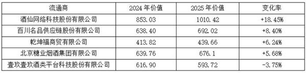 酒類流通商在本輪酒行業調整期中表現出強勁韌性,2024-2025年集中度持續提升,頭部企業通過渠道整合與數字化紅利(流通商年均數字化投入增長40%+)、技術賦能(AI選品和動態庫存系統提高周轉效率30%),進行深化變革,實現了規模擴張。前十大流通商品牌價值總和從5,177.44億元增至5,254.41億元,增長1.49%。