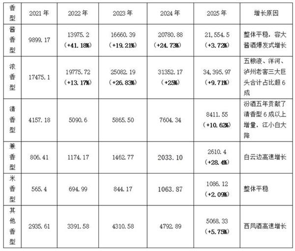 表2:后疫情時代(2021–2025年)白酒各香型價值變化、增速變化(單位:億元)