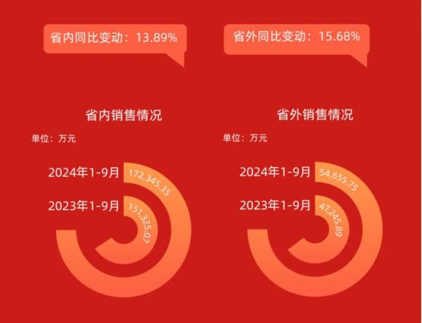 前三季度,金徽酒在甘肅省內市場繼續鞏固和擴大,實現營收17.23億元,同比增長13.89%;在省外市場實現營收5.47億元,同比增長15.68%。其中,省外地區第三季度收入1.71億元,同比增長37.91%。
