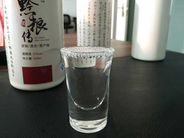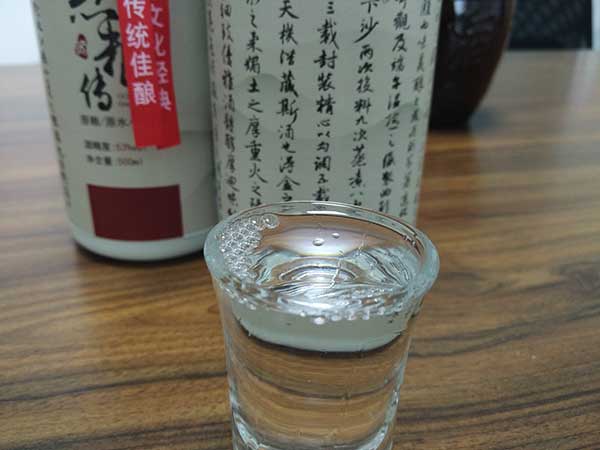 舉起酒杯,對光細看,酒體非常清澈,色澤微黃,略重于白水。輕輕晃動,還能看到類似油脂的物質在酒體中擴散下沉,油性非常好,杯壁上酒痕道道,猶如淚滴,楚楚動人。