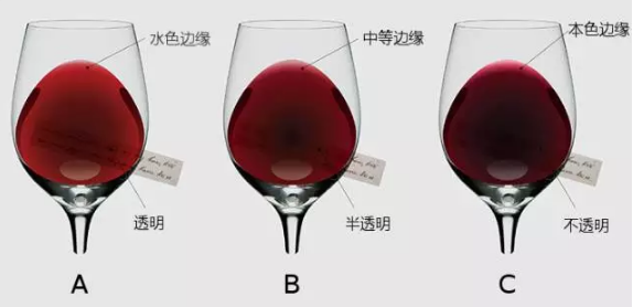 酒色透明度較高,色彩強(qiáng)度也較低,同時(shí)邊緣色帶接近水色,這種類型的葡萄酒酒體輕盈,單寧較低,同時(shí)含有較高的酸度。