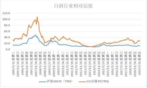 與滬深300指數相比,白酒行業始終不便宜,13、14年行業大調整時兩者估值接近。目前白酒行業估值水平處于歷史中間偏上水平。