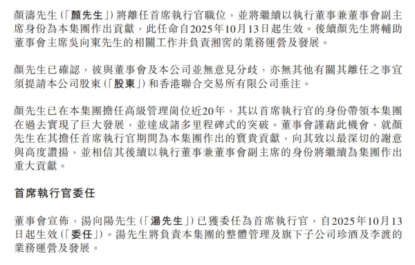 10月14日,珍酒李渡公告稱,湯向陽接替顏濤出任公司新任首席執行官(CEO)。
