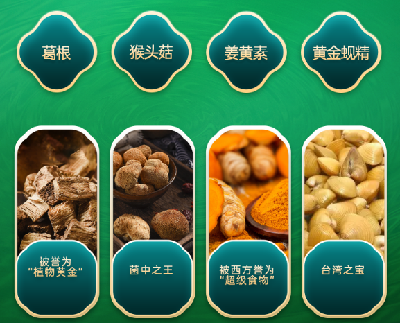 據悉,酔玖立舒所選用的四大核心原料,是被譽為“超級食物”的姜黃素、“植物黃金”的葛根提取物、“菌種之王”猴頭菇、“臺灣之寶”黃金蜆精等珍稀原料和藥食同源食品,可以幫助腸胃快速吸收,輔助身體排毒器官將酒精排出體外。在安全方面,酔玖立舒的每樣成分都經過實驗論證,且有其相關專利和文獻證實。