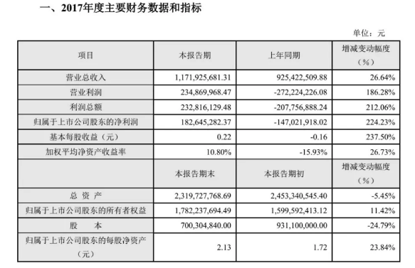 快報(bào)顯示,2017年?duì)I業(yè)總收入11.72億元,增長(zhǎng)26.64%,歸屬上市公司股東凈利潤(rùn)1.83億元,同比增長(zhǎng)224%,2016年為虧損1.47億元。至此,經(jīng)歷了多年調(diào)整后,百潤(rùn)實(shí)現(xiàn)了扭虧為盈。
