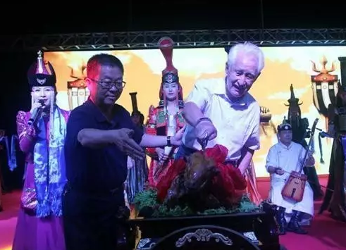 茅臺集團名譽董事長季克良先生在歡迎晚宴上為蒙古族特色全羊宴剪彩