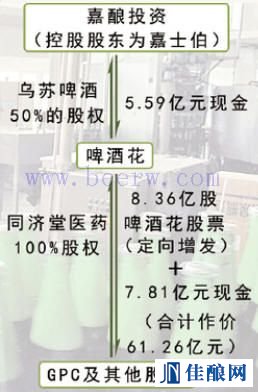 ●2005年巨額虧損的啤酒花第一次重組,其背后正是藍劍與嘉士伯交握的雙手。彼時,藍劍與嘉士伯共同投資成立的藍劍嘉釀接手了啤酒花46.09%的股權,成為第一大股東。而在藍劍嘉釀中,嘉士伯持股48.93%,藍劍持股為51.07%,由此新疆烏蘇啤酒成功牽手嘉士伯,成為其麾下合資控股子公司。其后,藍劍嘉釀通過啤酒花整合了烏蘇啤酒與新疆啤酒等啤酒資產(chǎn):烏蘇啤酒100%控股新疆啤酒,而啤酒花則擁有烏蘇啤酒50%股權。