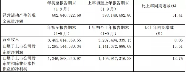 10月28日,口子窖發布2019年第三季度報告,公司前三季度實現營收34.66億元,同比增長8.05%;凈利潤12.96億元,同比增長13.51%,繼續保持雙增態勢。