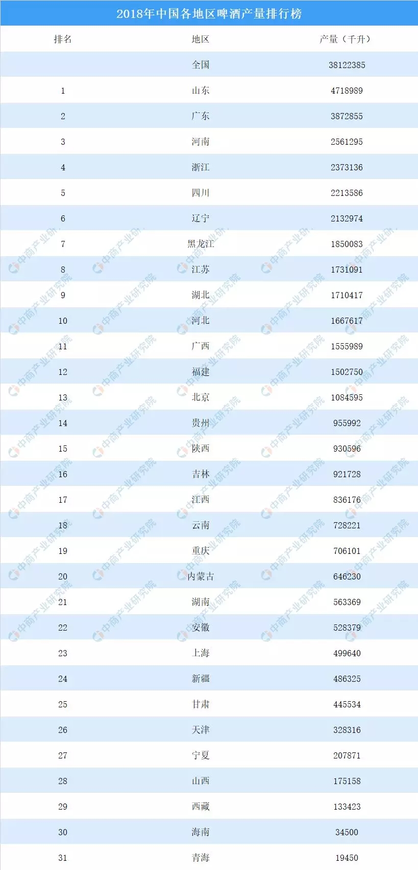 從全國各省市產量來看,2018年啤酒產量排名前十的地區是山東、廣東、河南、浙江、四川、遼寧、黑龍江、江蘇、湖北、河北。