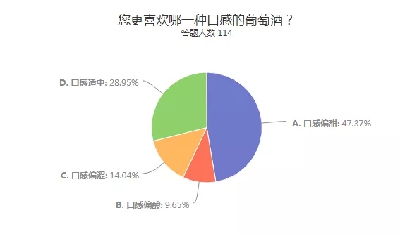口感偏甜的葡萄酒受到近半數人的喜愛,占比為47.37%,其次為口感適中的,占比為28.95%。而從交叉結果顯示,女性對甜型葡萄酒的愛好程度要遠高于男性。由于受生活環境和口味習慣的影響,偏酸偏澀的葡萄酒并不受年輕消費者的喜愛。