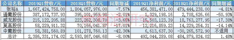 截至2019年5月3日,張裕、通葡股份、威龍股份、莫高股份以及中葡股份五家主板上市的葡萄酒企業已全部披露了其2019年第一季度業績。整體來看,這五家企業今年一季度共實現營收23.86億元,較之2018年第一季度的25.94億元相比下降了8%;實現凈利潤4.92億元,較上年同期的4.85億元相比,微增1.48%。