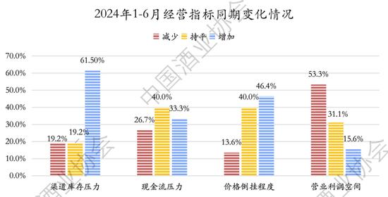 在前不久舉行的2024貴州白酒企業(yè)發(fā)展圓桌會議上,宋書玉表示,白酒產(chǎn)業(yè)仍將處于去庫存周期,2024年酒類消費(fèi)的核心詞是性價(jià)比。而此次《報(bào)告》也指出,由于庫存高企、渠道壓貨嚴(yán)重,導(dǎo)致動銷暫不及往年。今年1-6月與去年同期相比,經(jīng)銷商、終端零售商在經(jīng)營方面,超過60%表示庫存增加,超過30%表示面臨著現(xiàn)金流壓力;超過40%表示實(shí)際銷售價(jià)格的倒掛程度有所增加,超過50%表示利潤空間有所減少。