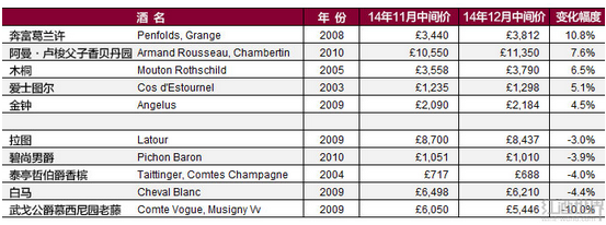 而反觀下滑榜,11月份在漲幅榜中拔得頭籌的泰廷哲伯爵香檳2004年份酒(Champagne Taittinger Comtes)價格回落,而2009年份的波爾多名莊酒如拉圖(Latour)、碧尚男爵(Pichon Baron)以及白馬(Cheval Blanc)則持續低迷,占據跌幅榜5強中的三席。