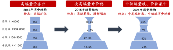 自2017年開始,白酒行業進入了新的發展周期,但和“黃金十年”對比,新的周期中有著明顯的特點——高端量價齊升,次高端量升價穩,中低端量跌價位集中。
