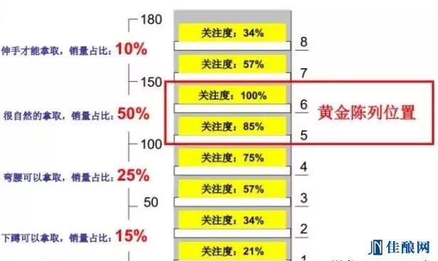 在同一組貨架上,因為顧客注視的方式不同,所以不同陳列位置產生的銷量會有不同的變化,一般來說,與視線平齊的位置陳列的商品銷量最高,而顧客需要仰望和蹲下才能注視的商品銷量相對要低。如圖所示: