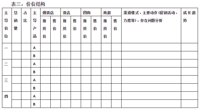 三個結構即指:品牌結構、渠道結構、價位結構。通過三個結構能清晰地判斷出來市場競爭現狀。特別指出的是,一定要判斷趨勢,因為做市場,就是做機會,而機會一定是在于對市場的趨勢和動態判斷之中才會產生,是打破了靜態的動態運動機會。最后在結論上形成四個表,如表二、表三、表四、表五。