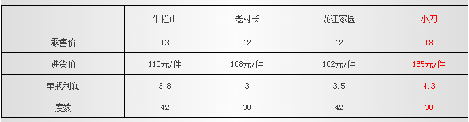 通過以上數(shù)據(jù)我們可以看出,小刀酒的零售價和終端利潤空間要遠遠大于其他競品。值得注意的是,小刀的零售價也高于競品。對此,該市場負責(zé)人告訴記者,主要一是為了提升產(chǎn)品品牌形象,二是為了迎合消費升級。