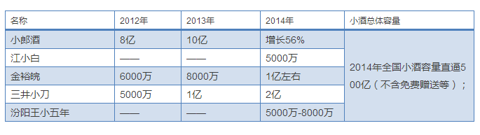 全國化小酒以小郎酒為代表,其承載著較強的名酒基因,則江小白一直主打的青春路線,不容小視;而三井小刀、金裕皖、汾陽王在全省化運作上打造親民化小酒,也具有較為突出的表現,從全國整體小酒容量數據來看,小瓶酒的市場份額確實是一塊很大的蛋糕。