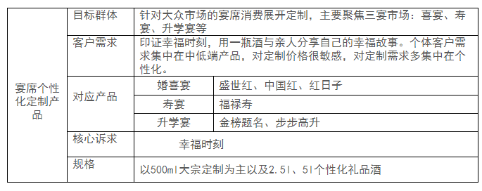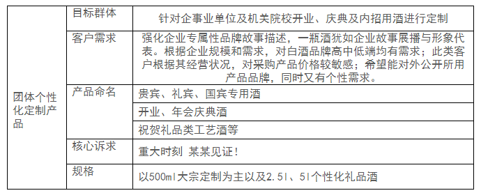 定制化產品首先以群族特色完成市場突破,如茅臺定位國酒定制,與飛天茅臺群體相對應,從而實現品牌化、市場化,進而打造超級產品、超級品系。定制型產品想要在市場上取得突破性增長,關鍵在于如何圍繞目標群族定位,開展私人個性化定制、宴席個性化定制和團體個性化定制產品市場的開發,主要開發模型如下: