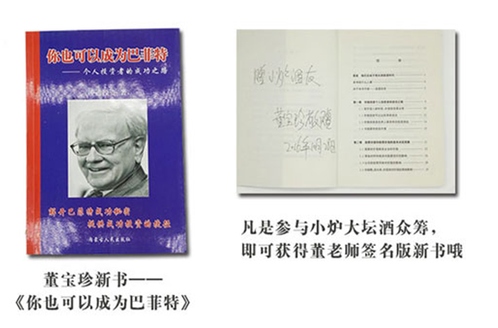 小爐醬酒的發(fā)起人羅羽先生(新浪微博:@大嘴羅羽)是我的朋友,他在幾個(gè)月前組織了一次小爐醬酒的眾籌,取得了巨大的成功,經(jīng)過(guò)精心準(zhǔn)備小爐醬酒第二季眾籌又開始了。在籌備小爐醬酒第二季眾籌前,小爐醬酒創(chuàng)立者羅羽先生找到我想把我的書籍《你也可以成為巴菲特》作為禮物送給參與眾籌的朋友,我當(dāng)然很愿意支持。